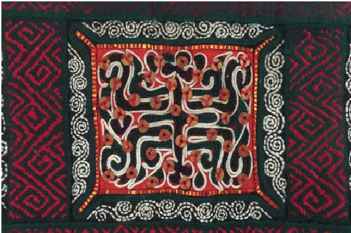 背兒帶上端的背帶手上繡有連續(xù)的螺絲紋。水族是南方的稻作民族,而螺螄是水田中常見的動物,其繁殖屬性為多產(chǎn)。心靈手巧的水族女性將日常生活中的動物形象,經(jīng)抽象變形而變成簡練的紋樣,象征著生命的不斷繁衍。