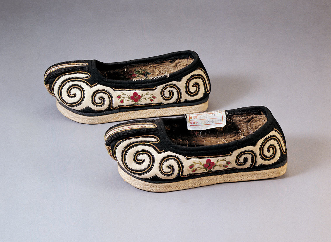 土族民國(guó)時(shí)期云紋雙梁繡花男布鞋,中央民族大學(xué)民族博物館館藏