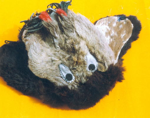 傳統(tǒng)的達斡爾男子服飾為大襟皮袍,袍子前襟正中開衩,以便于騎乘。開衩處有幾何形的圖案裝飾,兼顧牢固和美觀。男褲分皮褲和皮套褲兩種。皮褲的皮料若取自夏季狍皮則可春秋穿,而毛厚的秋冬料則用于冬季皮褲。皮套褲上端有帶系于腰上,利于保暖,適合在冰雪環(huán)境中活動。在皮套褲的膝處常有圓形臺紋樣,以云卷紋居多。男帽除了仿生帽外還有長毛皮帽、馬鞍型的元寶帽。男子在冬季戴帶腰的皮手悶子。這種手套只有拇指分出,且在手腕處有口,可在勞作時將手方便地伸出來。達斡爾族男子腳上常穿柔軟的板皮做腰的軟底短靴,或者穿白布腰黑邊的皮底軟靴。靴左右腰上多古錢紋、蝴蝶紋等補花飾,與契丹短靴造型很相似。
