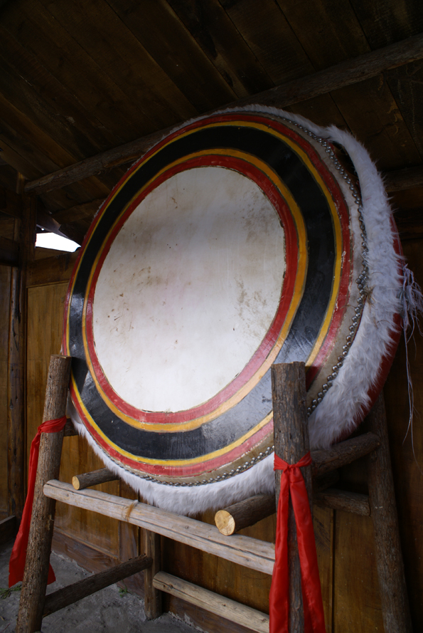 羌族羊皮鼓是打擊樂(lè)器,又名“羌鈴鼓”,羌語(yǔ)稱“切歐?!薄扒袩釀e日木”。有兩種形狀,一種是圓形鼓面的鈴鼓,直徑大約30—40厘米。鼓邊寬約15厘米,鼓柄置于正中,抓柄的長(zhǎng)度與鼓面的直徑相同,左手從背面握柄。另一種是扇子形狀的鈴鼓,鼓框和鼓柄為鐵制,抓柄端有一裝飾環(huán)圈,圈內(nèi)串以數(shù)個(gè)銅錢(qián)。兩種形制鼓面均蒙羊皮,各鼓音高低不一,鼓錘為竹制,敲擊的一端略微呈弓形。羊皮鼓的打法和鼓點(diǎn)的節(jié)奏變化豐富。目前,搜集到的有硬三鞭、軟三鞭、野雞撲、偷點(diǎn)子、牛擦癢等十多種。這些鼓點(diǎn)穿插在每個(gè)唱段與舞蹈銜接變化中,使表演者在統(tǒng)一的步伐、統(tǒng)一的動(dòng)作中,調(diào)節(jié)了節(jié)奏氣氛。由于表演具有即興式特點(diǎn),表演者的技術(shù)嫻熟程度和思想情緒變化將直接影響技巧的發(fā)揮。羊皮鼓突出鼓的表演,氣氛熱烈歡快,動(dòng)作粗獷質(zhì)樸,如“禳星辰”動(dòng)作,就是在鼓點(diǎn)、唱腔、動(dòng)作的有機(jī)結(jié)合中,表現(xiàn)出凜冽的氣勢(shì)。羊皮鼓在表演中,不僅給舞蹈提供了節(jié)奏,豐富了氣氛,而且鼓點(diǎn)的擊打更形成和衍化出許多獨(dú)特的舞蹈語(yǔ)匯。