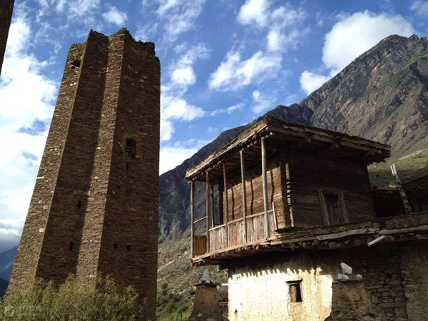 在羌語中,碉樓被稱為“邛籠”,意為美麗、高貴的房子,早在2000年前《后漢書·西南夷傳》就有羌族人“依山居止,壘石為屋,高者至十余丈”的記載。碉樓的高度在十米至三十米之間,用于御敵、貯存糧食和柴草。碉樓有四角、六角、八角幾形式,有的高達十三四層。建筑材料是石片和黃泥土,墻基深1.35米,以石片砌成。石墻內側與地面垂直,外側由下而上向內稍傾斜。修建時不繪圖、吊線、柱架支撐,全憑高超的技藝與經(jīng)驗。建筑穩(wěn)固牢靠,經(jīng)久不衰。自唐朝來,羌族人民因各種原因向西北遷移,到了西藏和青海,所以現(xiàn)在,羌族碉樓也往往被稱為藏族碉樓。