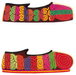 羌族男女皆穿羊皮坎肩和寬大袍衫、系腰帶,腳穿云云鞋,女子系繡花圍裙和飄帶,戴繡花頭帕。其中刺繡精美的云云鞋可以代表羌族刺繡的藝術(shù)水平,羊角花紋是云云鞋的主要紋飾,因其線條流暢如行云,故得名云云鞋。其實(shí),這與羌人崇拜天神的信仰有關(guān),天神就居住在高高的云空之中。此外,羊角紋還體現(xiàn)了羌人曾以羊?yàn)閳D騰的古老信仰。關(guān)于云云鞋還有個(gè)傳說(shuō):相傳,一個(gè)生活在湖泊中的鯉魚(yú)仙子看見(jiàn)放牧的羌族少年赤腳,十分心疼,于是摘下一朵白云彩,折來(lái)一束羊角花,做成繡鞋相贈(zèng)。后來(lái)他們相愛(ài)了,成了一對(duì)最幸福的人。從此這種有著羊角花紋的云云鞋就成了愛(ài)情的象征,羌族民間云云鞋也多作為情感的信物贈(zèng)送意中人。千百年來(lái),羌族刺繡就這么把美麗點(diǎn)綴在生活中,比傳說(shuō)和記憶更生動(dòng)美好。