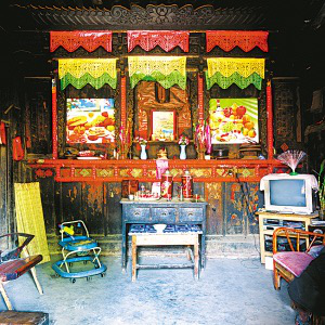 隴川縣戶撒鄉(xiāng)曼旦寨是阿昌族古老的村寨之一,明、清時期的老宅皆以楠木建造,數(shù)百年不朽、無蟲蛀。受漢族文化影響,傳統(tǒng)民居大都是土木石結(jié)構(gòu)的三合一照壁或四合院落。正房建在長方石條加土方壘起的屋基上,屋基下為院壩,以三層石階上下。正房三開間,四排五柱,中柱起脊,形成雙斜面屋頂,上覆凹型青瓦。后墻和兩側(cè)山墻以土坯砌筑,外面不抹泥,左右是廂房或照壁。室內(nèi)隔墻均為木板,中間一間為堂屋,有一米多寬的吞口,六扇雕刻的木板門,平時只開中間兩扇。兩邊的檐柱頭有粗獷的木雕。吞口有走廊的作用,一般左側(cè)角設(shè)臉盆架以供洗漱,板壁上掛小鏡框以便梳妝,旁邊掛著家人的照片。有的擺著縫紉機(jī),有的放藤椅小憩。右側(cè)放臨時的農(nóng)具,掛衣服,板壁上貼著影視明星的招貼畫。堂屋正面板壁是通高的木雕佛龕,供奉佛像和傣文的經(jīng)文,龕楣上貼著三至四層掛錢,下面有燭臺、香爐。左側(cè)擺著電視機(jī)、熱水瓶、茶桌,板壁上掛著戶撒刀和手工編織的背兜,右側(cè)有專供老人休息的床或藤椅,也有的砌火塘,火塘的小土臺上放著炒菜的調(diào)料、火柴和照明燈具。