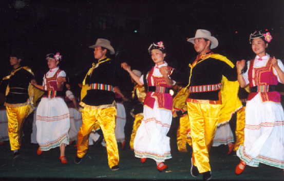 普米族的民間娛樂舞蹈,普遍具有歌、舞、樂三位一體的特點。舞蹈形式正如普米族民歌所唱的:“如金線把珍珠穿成一串,手拉手跳成十五的月亮?!眾蕵肺璧溉鞘掷洲D(zhuǎn)圓圈的舞蹈形式。人們挽手而跳,伴以高亢洪亮、情感激越的唱詞。特別是普米族婦女雪白的長裙隨舞步輕盈飄旋,似白鷺翻飛,正如《打跳歌》中所唱的:“笛聲不停莫歇腳,舞場上沒有陡巖子,腳底板下沒有刺,跳它個地動山也搖?!痹谙矐c的集會之夜,歡快的娛樂性舞蹈,往往一跳就是通宵達旦。跳鍋莊是普米族傳統(tǒng)的舞跳形式,這種舞蹈不受時間空間的限制,只要一支竹笛或葫蘆笙,有一塊空地即可進行,少則三五人,多則數(shù)百人。一般總是在傍晚,在院內(nèi)或場壩上舉行。跳舞時,總要在中間燃起一堆火,與室內(nèi)的鍋莊相似,所以稱之為鍋莊舞。鍋樁內(nèi)容很豐富,從古代的游牧、狩獵、紡織到今天的趕街、慶豐收、烤酒等都有反映。流行的曲調(diào)有《放單調(diào)》《出山》《獅子舞》等等?,F(xiàn)在,鍋莊舞已發(fā)展成為集唱詞、曲調(diào)、舞蹈、音樂于一體的綜合性歌舞藝術(shù)。