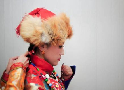 裕固族婦女有戴帽子習(xí)慣,所以帽子的制作精良別致。在裕固族的傳統(tǒng)婚禮上,新娘要戴上狐皮帽子成親配對,這一習(xí)俗還有一個傳說流傳至今。