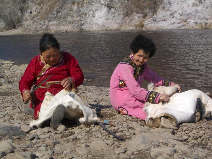 鄂倫春人過去在家庭公社“烏力鄰”里,同生產(chǎn)共消費(fèi),在當(dāng)時生產(chǎn)力十分低下的情況下,憑著扎槍和弓箭,單個人很難獲得能夠滿足衣食需要的獵物,必須要有“烏力鄰”全體成員的通力合作,才能戰(zhàn)勝兇猛和龐大的野獸,所以,在“塔坦達(dá)”領(lǐng)導(dǎo)下的集體狩獵是當(dāng)時最主要的勞動形式。隨著生產(chǎn)力的不斷發(fā)展和個體小家庭的大量流動,不僅社會組織“烏力鄰”由原來血緣性的家庭公社演變?yōu)榈鼐壭缘牡赜蚬纾瑒趧咏M織也隨之發(fā)生了極大的變化。集體狩獵已不再是“烏力鄰”傾巢出動,而是由幾個小家庭的成員自愿結(jié)合成“安嘎”來進(jìn)行。同時還出現(xiàn)了集體和個人等多種勞動形式。狩獵也不再單純是為了滿足衣食的需要,剩余獵物可以拿去交換,獵產(chǎn)品已趨于商品化。故此時一些珍貴的細(xì)毛皮張和藥用價值較高的獸類,成了鄂倫春人主要的狩獵目標(biāo)。這樣就形成了一年中的四個狩獵旺季,即:農(nóng)歷正月至2月是“鹿胎期”;4月至6月是“鹿茸期”;9月至落雪為“叫鹿尾期”;落雪后至來年開春是“打皮子期”。大概是源于原始的圍獵,鄂倫春人把狩獵叫“打圍”,而這四個狩獵旺季就叫“紅圍期”?!凹t圍期”除“叫鹿尾期”外,都組織“安嘎”集體出獵?!鞍哺隆笔且环N臨時性的狩獵組織,狩獵旺季將臨時,由一人發(fā)起,串聯(lián)幾位親朋好友或志趣相投的人組成一個“安嘎”,待獵期結(jié)束,“安嘎”自行解散,下次出獵時再重新組合,因此其成員并不是固定的(圖為熟化狍皮,吳雅芝攝影)。
