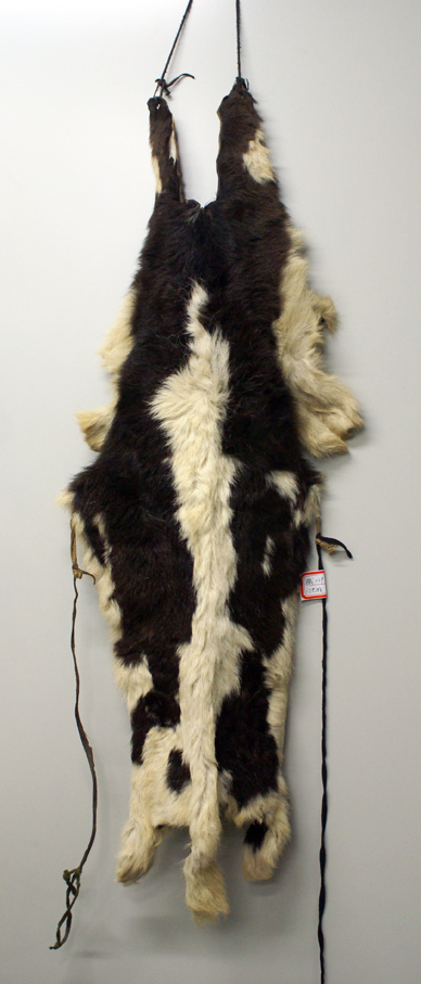 門隅南部地區(qū)的門巴族婦女,不分老少,袍服外披一張較為完整的小牛犢皮或巖羊皮,毛朝內(nèi)、皮板朝外,牛皮頸部朝上,尾部朝下,略做加工、而且四肢皮伸向兩側。以此為美飾,吉慶節(jié)日或訪親會友,都要披一張新牛皮做盛裝。傳說,唐代文成公主進藏時背上披著皮子以避邪,后來此物賜給門隅婦女,后此物就成為門巴族婦女歷來沿用的裝束。