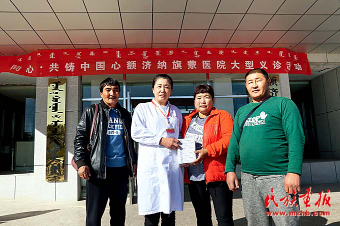 在額濟(jì)納旗蒙醫(yī)醫(yī)院開展的義診活動(dòng)上,專家們向蒙古國患者贈(zèng)藥。