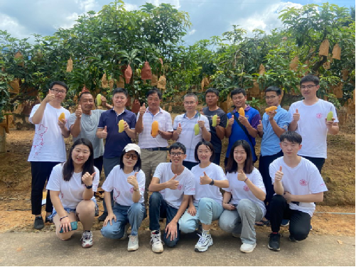 一是恩樂鎮(zhèn)復(fù)興村晚熟芒果基地調(diào)研。9月3日上午實踐團前往恩樂鎮(zhèn)復(fù)興村晚熟芒果基地考察,了解該基地的主要栽培品種,提出當(dāng)?shù)孛⒐耘嗟膬?yōu)勢及目前亟需解決的問題,并為農(nóng)戶進行相關(guān)栽培技術(shù)的講解,為當(dāng)?shù)赝硎烀⒐?xì)化管理提供技術(shù)支撐。同時實踐團選取不同海拔生長旺盛、豐產(chǎn)、穩(wěn)產(chǎn)的成年樹,隨機采摘果形均勻、健康飽滿、無機械損傷和病蟲害的成熟果,以及套上不同果袋子的果實,如白袋、紅袋和黃袋,所有樣品采摘后立即送回實驗室,對其單果重,果實縱徑、橫徑、厚度、總可溶性固形物、果形指數(shù)及風(fēng)味等綜合性狀進行測定,探究不同海拔和果袋對芒果果實品質(zhì)的影響,以期為生產(chǎn)實踐提供理論指導(dǎo),提高果實品質(zhì)。