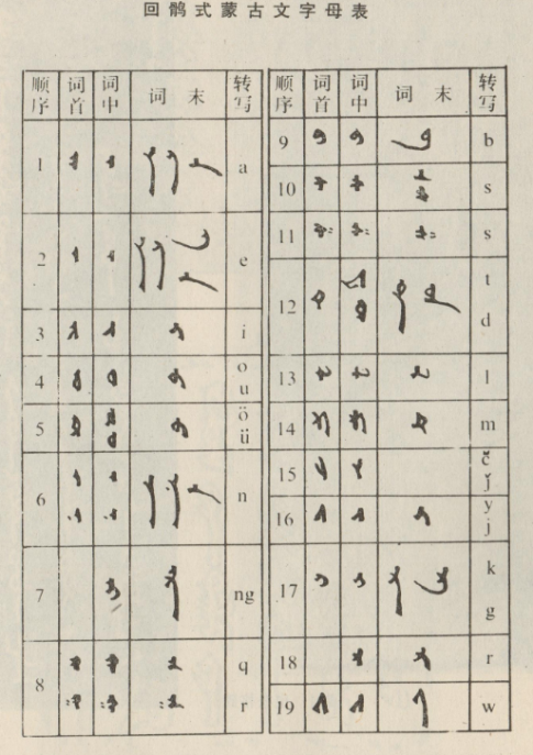 回鶻式蒙古文是一種拼音文字,字母分表示元音和表示輔音的兩大類。書寫時元音字母和輔音字母結(jié)合得很緊,筆畫連在一起,一氣呵成。最小的書寫單位是詞。但早期拼寫法不甚嚴密,有一個詞分做兩段書寫的情況。書寫格式是從上往下豎寫,從左往右移行?;佞X式蒙古文字母在詞首、詞中、詞末等不同位置上筆畫略有變化,以適應連寫的需要。