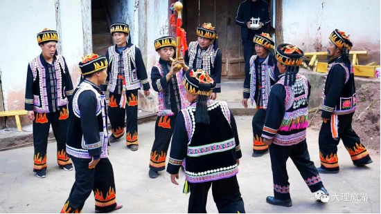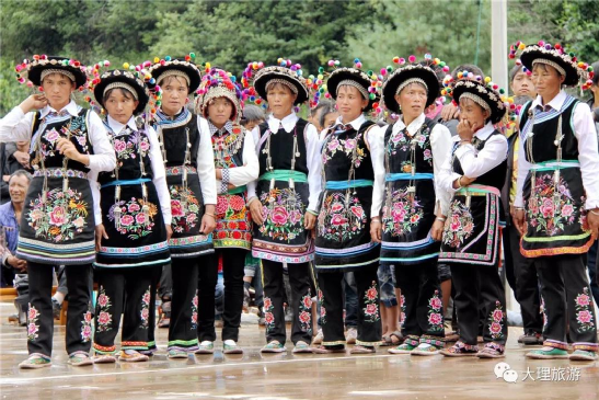 男子頭頂氈帽(又稱氈窩),穿大襟衣、大襠褲,赤足或穿草鞋,披羊皮,外出背皮袋(現(xiàn)已基本消失)。女子裹高包頭、額上飾銀桂花,衣為布襟,外套坎肩,腰系大圍腰,大圍腰左右下三邊繡五色花,為動植物圖案,足穿繡花鳳頭鞋,用本地產(chǎn)綠布條制褲子,不鎖腳邊,腰間背圓形白氈裹背,所穿服飾顏色鮮艷、質(zhì)地厚重,盡顯遠古南詔皇室服飾遺風。