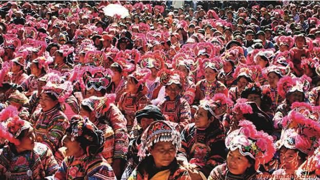云南省楚雄彝族自治州永仁縣彝族賽裝節(jié)上的“一片紅”。