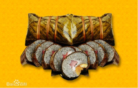 另一種是廣西壯族自治區(qū)寧明縣壯民在春節(jié)時做成的大壯粽。這種粽粑大得驚人,以芭蕉葉子包成,內(nèi)放一條剔去骨頭的腌豬腿,足有八仙桌那么大。包好的粽粑放在大水缸里,注滿清水,蓋嚴(yán)缸口。在大缸外面用稻草繩子繞滿。煮的時候,先點燃草繩。再在四周不斷加放谷殼,一連燒七天七夜,粽粑便熟透了。春節(jié)時,歡樂的人民抬著大粽粑游街祭祖。然后同族的人分食這只吉祥的大粽粑,以示大家同心同德,和睦美滿。