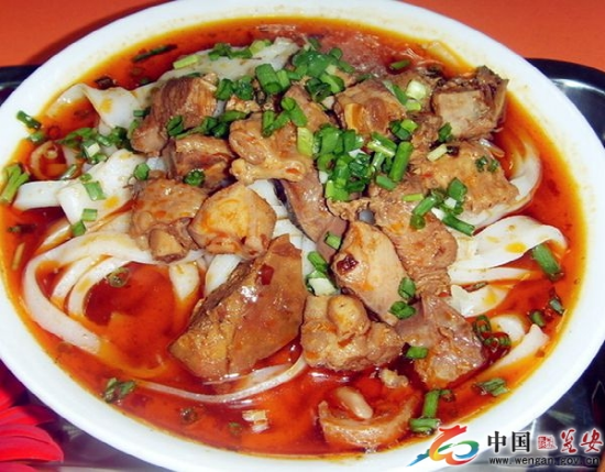 貴州甕安辣雞粉的制作過程非常精細(xì)。分成粉(甕安叫“米皮”)和辣子雞的制作,甕安辣雞粉作為早餐,早就名聲在外,看上去紅油與米粉,紅白相間,相映成趣;吃起來辣香兼?zhèn)洌瑵櫥?。甕安辣雞粉是黔菜中一道經(jīng)典小吃。