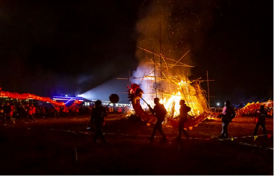 更具特色的要數(shù)正月十五趕毛狗子了。傳說毛狗子(狐貍的俗稱)喜歡偷雞吃,所以必須得趕走。趕毛狗這一天,親朋好友聚在一起,先用竹筒做成火把或用木梓油做成燈備用,再砍樹枝搭成棚子,放入草扎的毛狗子,堆放未破節(jié)的竹筒和火炮樹葉。待天黑,男女老少全部出動(dòng),在屋邊及路邊插上點(diǎn)燃的火把、燈,然后燒燃毛狗棚,這邊的人群發(fā)出“哦嗬”聲,那邊的人群高喊“趕毛狗子喲!”此時(shí),滿山遍野火光沖天,叫喊聲此起彼伏,震耳欲聾,熱鬧非凡。