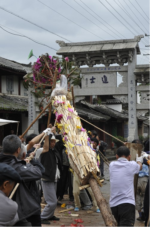 在劍川,都是由家里喜添子嗣的人家來籌備火把節(jié)的一切事宜,除了對新生兒的祝福,火把樹的裝扮也表示劍川人祈愿風(fēng)調(diào)雨順,人壽年豐、鄰里和諧?;鸢岩樱ㄩc年要扎十三層),上面六層的明子和柴分別由細(xì)到粗,一層接著一層,下面七層都是一樣的新柴。喻示每一個新的日子都紅紅火火。