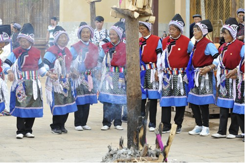 到了這一天,親友鄰居都不請自到來幫忙和祝賀。綁扎柴禾,做小彩旗,栓水果串等,等一切都好,再齊心合力豎起火把。等掛著果串的斗升一點(diǎn)點(diǎn)離開地面,火把樹穩(wěn)穩(wěn)當(dāng)當(dāng)挺立的時候,孩子的奶奶和外婆就在火把樹下燃起香,敬上茶酒和米干,虔誠地磕頭祈禱。