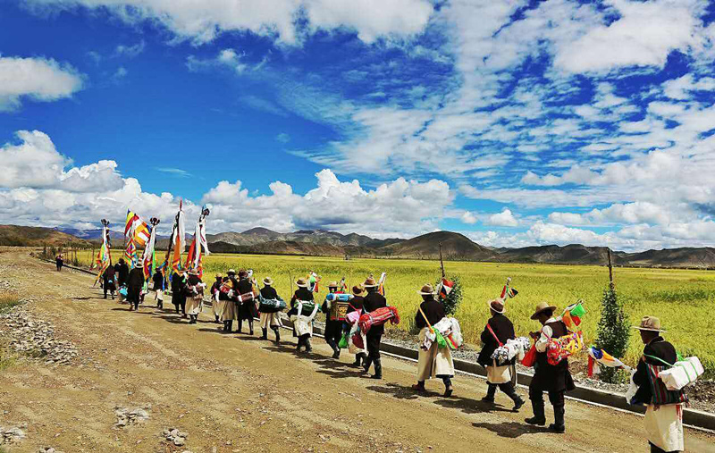 節(jié)日的第一天早晨,當(dāng)陽(yáng)光撒滿金黃麥田的時(shí)候,農(nóng)民們手持麥穗圍著農(nóng)田轉(zhuǎn)圈游行,最前邊是由喇嘛和老年農(nóng)民組成的儀仗隊(duì),高舉佛像,背著經(jīng)書,吹著佛號(hào),感謝上天給人們帶來(lái)了風(fēng)調(diào)雨順的好年成。轉(zhuǎn)完麥田以后,照例要在廣場(chǎng)上舉行群眾性文娛體育活動(dòng),其中有藏戲、歌舞、跑馬、射箭、拔河等,十分熱鬧。這天,家家戶戶都要準(zhǔn)備充足的酒食,穿上最漂亮的衣服,或者在廣場(chǎng)四周的草場(chǎng)上野餐,或者在村子里邀集親朋好友宴飲。青年男女則喜歡在晚上圍著篝火跳舞,對(duì)唱情歌,直到深夜。