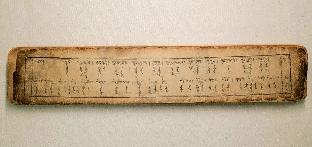 藏蒙對照詞典《詳解月光辭典》又稱《浩月輝映詞典》,該詞典由阿拉善拉隆巴阿旺丹德爾編著,清道光十八年(1838)北京嵩祝寺木刻本。1卷,139葉,頁面尺寸10.6×56厘米,版框尺寸7.5×49厘米,四周雙欄,梵來裝。每頁以藏蒙、藏蒙四行為階梯排列,每列35行,每行1字。頁面左側(cè)有藏文頁碼,右側(cè)有漢字《永》和漢文頁碼。