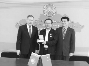 10月17日,艾克拜爾(中)被授予哈薩克斯坦外交部建立外交關系25周年金質(zhì)獎章,哈薩克斯坦駐華大使沙赫拉特·努雷舍夫(左)為其頒發(fā)了獎章。