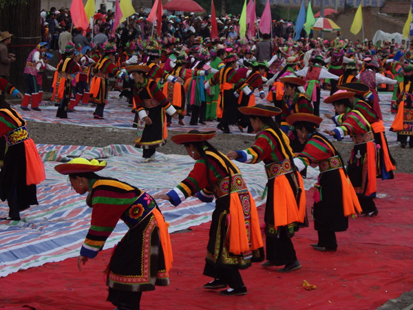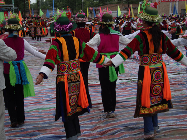 不同地區(qū)的土族舞蹈具有相對(duì)獨(dú)立性,互助的“安昭”、民和的“納頓”、大通的“踏灰”、同仁的“於菟”、甘肅卓尼的“嘎爾”等是最具代表的民間舞蹈?!鞍舱选?,土語(yǔ)稱之為“千佼日”,意為“彎曲”或“轉(zhuǎn)圈”,是土族民間喜慶節(jié)日和婚禮儀式中,用于禮贊祈祝的一種圓場(chǎng)群舞,也是一種歌舞結(jié)合、無(wú)樂(lè)器伴奏的集體舞蹈。一般由男女各半圍成圓圈,由一男子帶領(lǐng),一唱眾和。舞蹈動(dòng)作簡(jiǎn)單質(zhì)樸,舞者兩手由右胯旁起向左上方至右上方劃圓弧,變?yōu)樽笫智谀X前,右手高居于后,似雄鷹翱翔于藍(lán)天?!办遁恕蔽杓椿⑽?。“於菟”,是古代楚人對(duì)虎的方言稱謂。每年農(nóng)歷十一月二十日祭山神時(shí),名為於菟的舞者在赤裸的上身繪制虎豹圖案,模仿虎的形象“前端腿跳”舞蹈,達(dá)到祀神驅(qū)邪、祈求平安的目的。