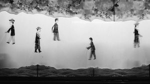“噔噔蹬蹬鏘鏘鏘……”伴隨著激昂的鑼鼓聲和歡快的二胡聲,皮影戲《黨的十九屆六中全會精神引領(lǐng)我們向前進(jìn)》開始演出(左圖)。
