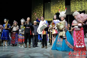 古樸的苗語、爵士的節(jié)奏碰撞出奇妙的藝術(shù)魅力。在第三篇章《未來的歌》中,《苗》《等待新娘》《NEW》《今宵醉》《苗嶺謠》《走了一山又一山》《干一杯》等曲目依次精彩上演,激情的旋律將本場音樂會推向高潮,現(xiàn)場觀眾深受感染。在蘆笙合奏《歡樂的苗家》歡快的旋律中,本場音樂會圓滿落下帷幕。