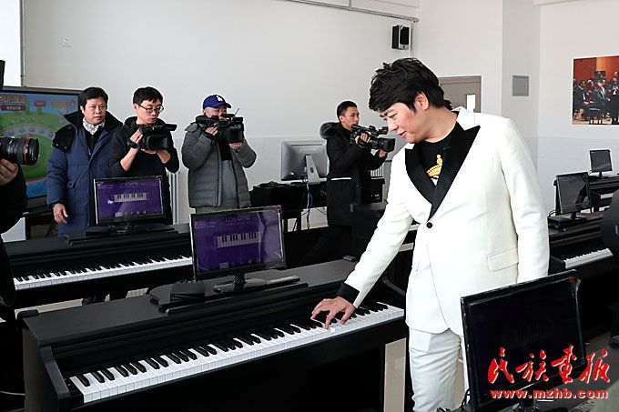 在“快樂(lè)的琴鍵”音樂(lè)教室捐贈(zèng)儀式上,朗朗與內(nèi)蒙古藝術(shù)劇院直屬烏蘭牧騎演員聯(lián)合表演了《鴻雁》。