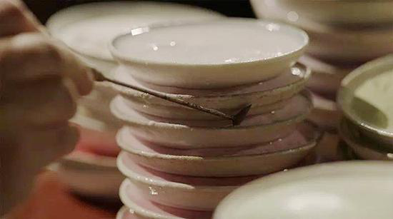 在每一個點藍(lán)的師傅面前,都由低到高排著一摞白色小碟,里面是摻了水的釉料。細(xì)看去,同樣是紫色,但從深紫到淺紫,竟然能分出十多種層次來。制作精良的景泰藍(lán)作品,對點藍(lán)要求很高。一片花瓣,要描繪顏色的漸變,就要由深入淺潤染幾個層次,才能表現(xiàn)出花朵特有的美感——這也是景泰藍(lán)的魅力所在,如果一朵花瓣只涂一二種顏色,功夫省了,景泰藍(lán)之美也消失了。