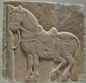 邊長(zhǎng)30.5厘米,厚5厘米,呈正方形。配有鞍具和轡具,韁繩系在拴馬柱上。馬取立姿,似在歇息。馬首微頷,雙耳直立,頸部粗壯,身體肥碩,前腿挺直,后腿微曲,長(zhǎng)尾及地。雕刻手法簡(jiǎn)練,平實(shí)而質(zhì)樸。