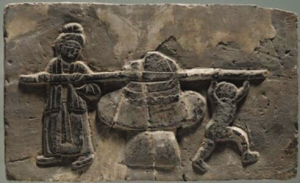 長(zhǎng)30.5厘米,寬18.5厘米,厚5厘米,呈長(zhǎng)方形。正面中間浮雕一挑擔(dān)男子,身穿右衽交領(lǐng)布衣、下著緊腿長(zhǎng)褲,扁擔(dān)由后面搭在雙肩擔(dān),被所挑重物壓彎,極富動(dòng)感。