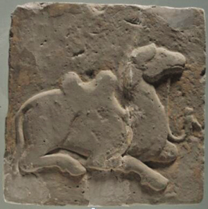邊長(zhǎng)20.5厘米,厚5厘米,呈正方形。駱駝構(gòu)圖充滿整張畫面。雙峰駝呈臥姿,頭部昂起,似乎是在傾聽什么,韁繩拴在木樁上,像是在等待主人拿來美味的草料。駱駝造型比例恰到好處,生動(dòng)傳神。