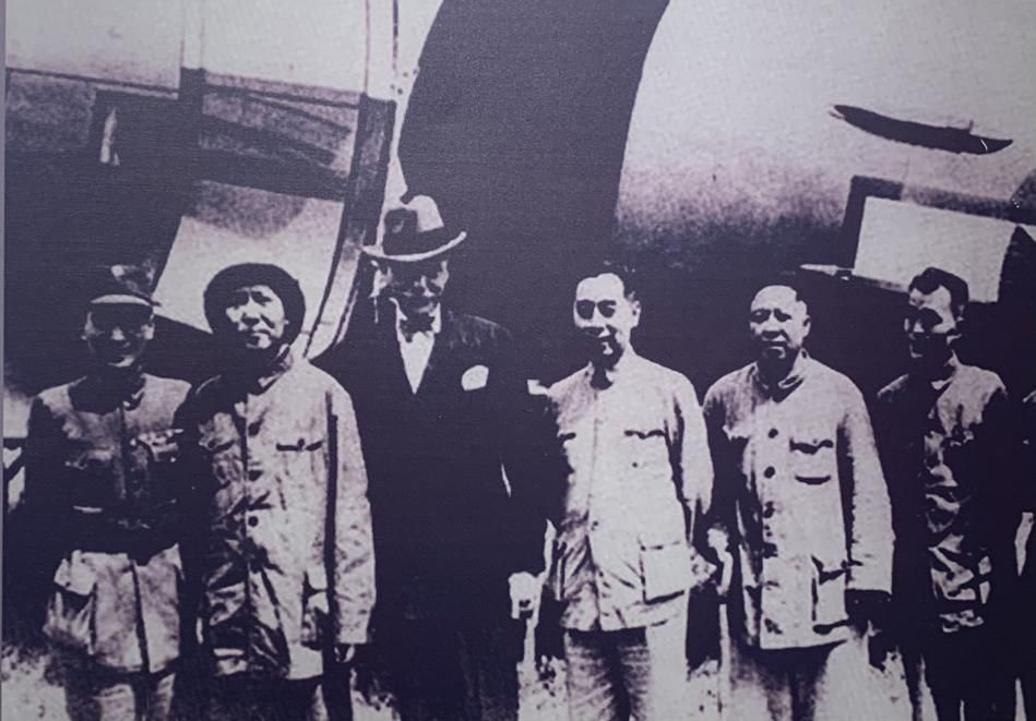 1945年,中共代表團在赫爾利(美國駐中國大使)、張治中的陪同下臨行前在延安機場合影,左起為張治中、毛澤東、赫爾利、周恩來、王若飛、胡喬木。(許覬佳攝于貴陽市達(dá)德學(xué)校舊址)