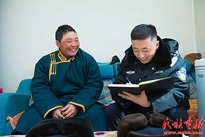 無論在哪個邊境派出所,敖日奇朗都跟牧民們以心交心,以誠相待,成為好朋友。如今,敖日奇朗在諾門罕布日德邊防派出所工作五年了,也常有新寶力格邊防派出所轄區(qū)牧民打來電話,咨詢法律問題,他每回都耐心地解答?!澳撩衽笥褌兊募冋尜|(zhì)樸平復了我剛到這里時躁動的心。邊境派出所是邊民生命財產(chǎn)安全的保障,隨時為轄區(qū)群眾牽線搭橋辦事。邊防警察與牧民的良好互動,會在關(guān)鍵時刻發(fā)揮重要作用,這恰恰也是我們開展走訪工作的意義所在?!卑饺掌胬矢锌?。