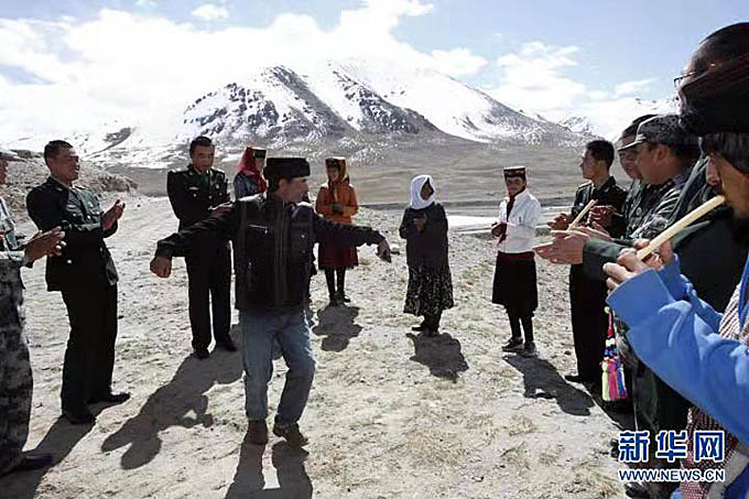 拉齊尼·巴依卡和邊防戰(zhàn)士一起與當地牧民群眾聯(lián)歡。(新華社記者 李翔 攝影)