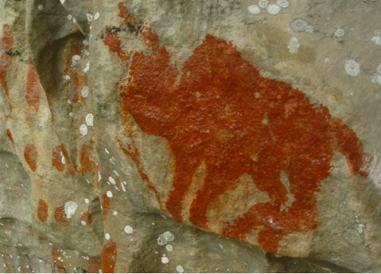 巖畫在石壁低部內(nèi)凹,可避雨,并有四處洞穴,依次下降,位置較高者為一出水洞,四季有水,其它洞穴開口小,內(nèi)部較寬、干燥,洞口處對應(yīng)石壁項(xiàng)部有明顯煙熏遺跡,似人為造成。
