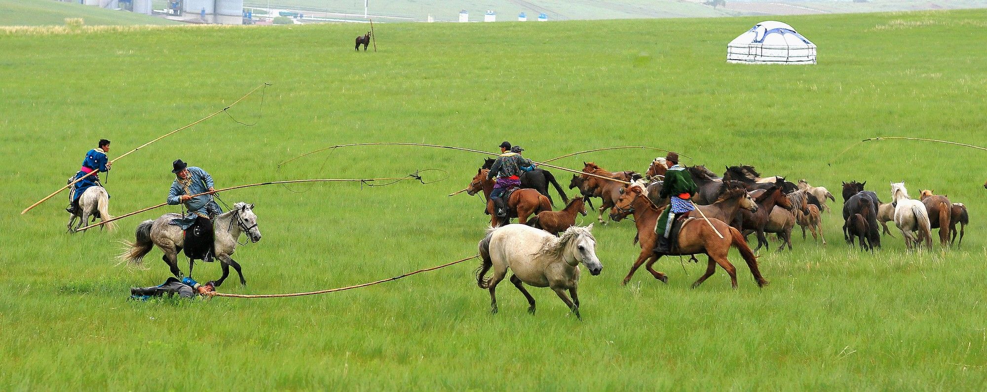 繩索套馬是蒙古族的傳統(tǒng)體育活動。原為牧民放牧時約束馬匹的一種手段。比賽時,選一烈性難馴的馬,先令其疾馳。參賽的成群騎手,手持打有活結(jié)的繩索,騎馬緊追,到一定距離,拋出繩索套馬,以先套準并能束住烈馬者為勝。