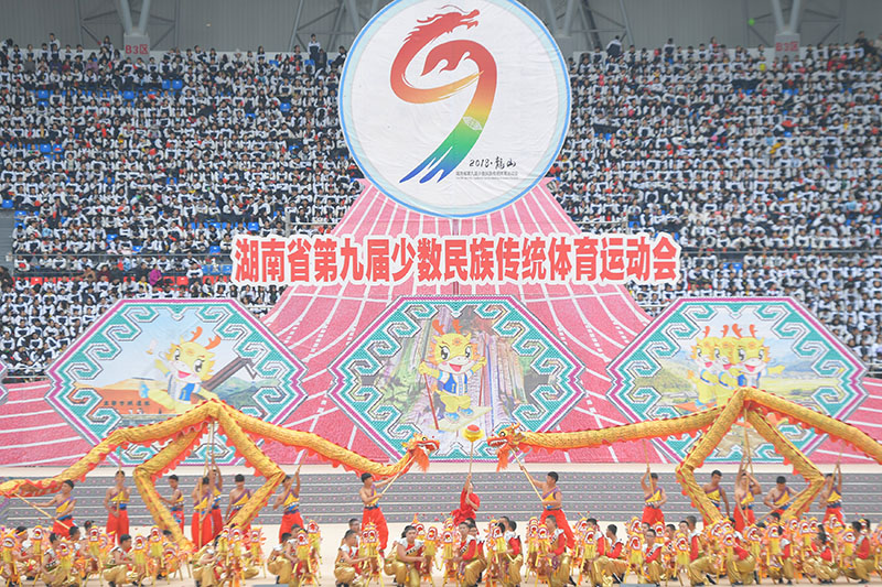 金風(fēng)送爽,丹桂飄香。10月16日至20日,湖南省第九屆少數(shù)民族傳統(tǒng)體育運動會在龍山縣舉行。本屆運動會以“龍山緣·民族情·中國夢”為主題,由省民宗委、省體育局、湘西州人民政府主辦,龍山縣人民政府承辦,共有來自湖南省14個市州和17個民族縣市區(qū)組成的31個代表團2631人參加,是湖南省歷屆少數(shù)民族傳統(tǒng)體育運動會規(guī)模最大、規(guī)格最高、參賽人數(shù)最多的一次。運動會期間,來自土家、苗、瑤、侗、白、維吾爾、壯、回、漢等22個民族的1991名運動健兒角逐高腳、秋千、板鞋競速、射弩、陀螺、蹴球、押加、毽球以及民族健身操9大項60個小項的競賽項目以及55個表演項目。