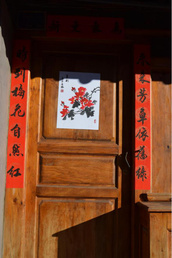 寫春聯(lián)繪年畫的傳統(tǒng)在劍川縣金華鎮(zhèn)由來已久,明朝洪武年間改土歸流和移民屯邊制度的推行,使儒家文化、理學(xué)思想逐漸融入邊疆人民的生活。金華古鎮(zhèn)居民受此影響,走上追求仕途功名的道路,文人鄉(xiāng)紳都以顯示儒學(xué)身份為榮。每逢春節(jié),人們會(huì)邀請有功名的仕子或傳學(xué)明經(jīng)的文人來到家中,撰寫對聯(lián),同時(shí)根據(jù)時(shí)令畫上一兩幅門神畫,希望通過此舉祈愿自家后生求得功名。如今走在金華古鎮(zhèn)西門街上,仍能看到家家種花養(yǎng)草,戶戶楹聯(lián)盈門,一派文風(fēng)蔚然的生機(jī)。