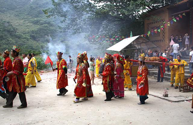 在酬謝自然之神后,由祭司念誦祭文,紀(jì)念民族英雄瓦氏夫人,頌揚(yáng)瓦氏夫人率領(lǐng)將士打擊倭寇的英雄事跡,傳授民族歷史知識,宣揚(yáng)保衛(wèi)家園、謀求平安的民族精神。