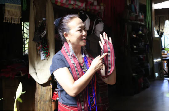 娜紅是勐梭鎮(zhèn)他朗村十組的老婦女主任,十多歲起開始學習佤族織錦技藝,隨后加入了李憲蘭工作室?!拔铱靠椮翦\為家里織出了兩層樓房?!蹦燃t感恩佤錦技藝為家里帶來的改變,從前是白天勞動,晚上織布,一年只能賣得2000元?,F(xiàn)在,每個月可以拿到3000元工資,年底還有分紅,日子越來越有盼頭。