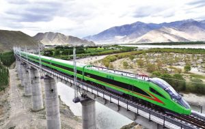 蒼翠的雅魯藏布江河谷中,全新的復興號列車呼嘯而過,與奔騰的江水一起向著“西藏江南”林芝駛去。