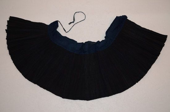 裙子為家織土布,青色細(xì)褶裙。圍腰中部為織,所繡圖案為魚(yú)紋、鳳鳥(niǎo)紋和“蝴蝶媽媽”、“人騎馬”等組合而成的幾何紋。